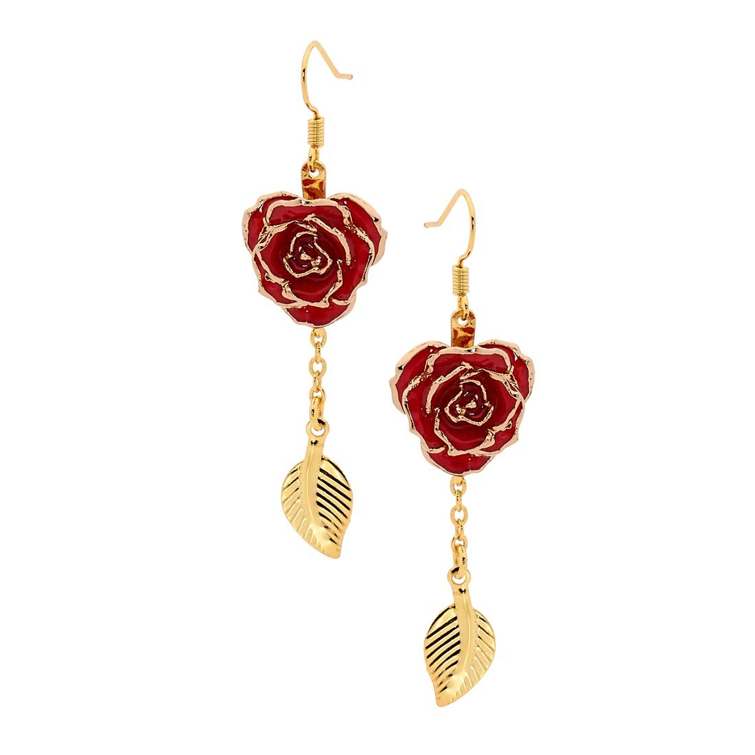- Une élégante paire de boucles d'oreilles qui présente un bout en forme de rose miniature finement vernissée, bordée d'or pur 24 ct, et d'un diamètre naturel assorti de 15,9 mm. Le magnifique motif de feuille plaqué or compris, la longueur totale d'une boucle d'oreille est de 1 à 1 et 1/4".