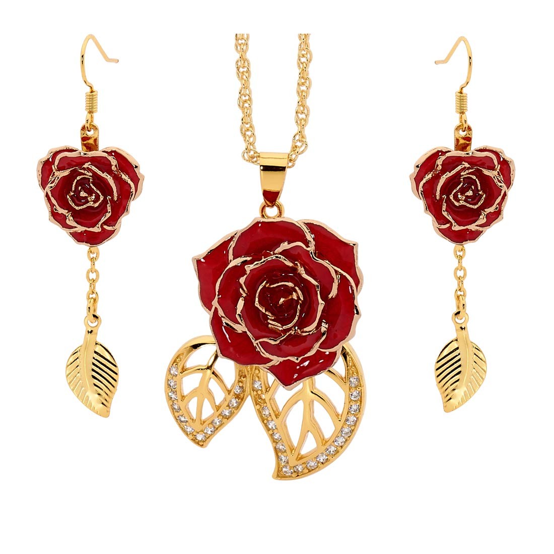 Cet assortiment d'une belle rose rouge émaillée et de bijoux en forme de feuille rouge comprend: