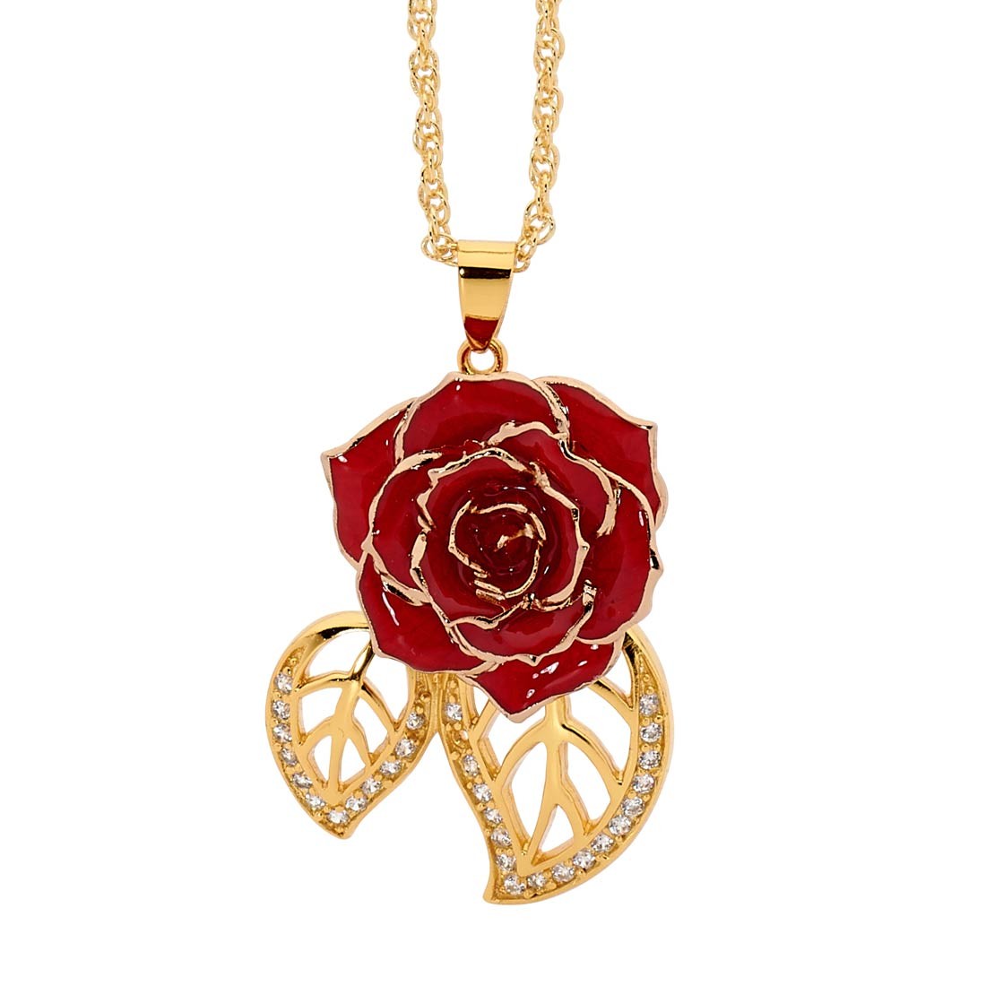 - Un élégant pendentif façonné à partir de véritables pétales de rose qui ont été vernissés et bordés d'or pur 24 ct. Pourvu d'une tête de rose miniature d'un diamètre de 3/4'', le pendentif fait 1 à 1 et 1/2" de haut pour une largeur de 1,1". La rose du pendentif est accompagnée de deux motifs de feuille incrustés de 30 diamants synthétiques et plaqués d'or 24 carats.