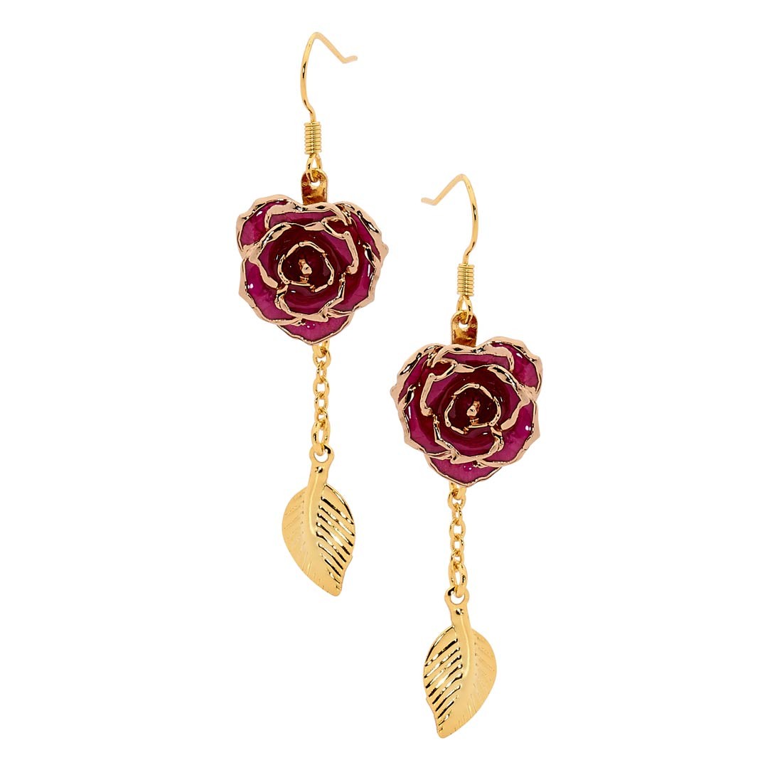 - Une élégante paire de boucles d'oreilles qui présente un bout en forme de rose miniature finement vernissée, bordée d'or pur 24 ct, et d'un diamètre naturel assorti de 15,9 mm. Le magnifique motif de feuille plaqué or compris, la longueur totale d'une boucle d'oreille est de 1 à 1 et 1/4".