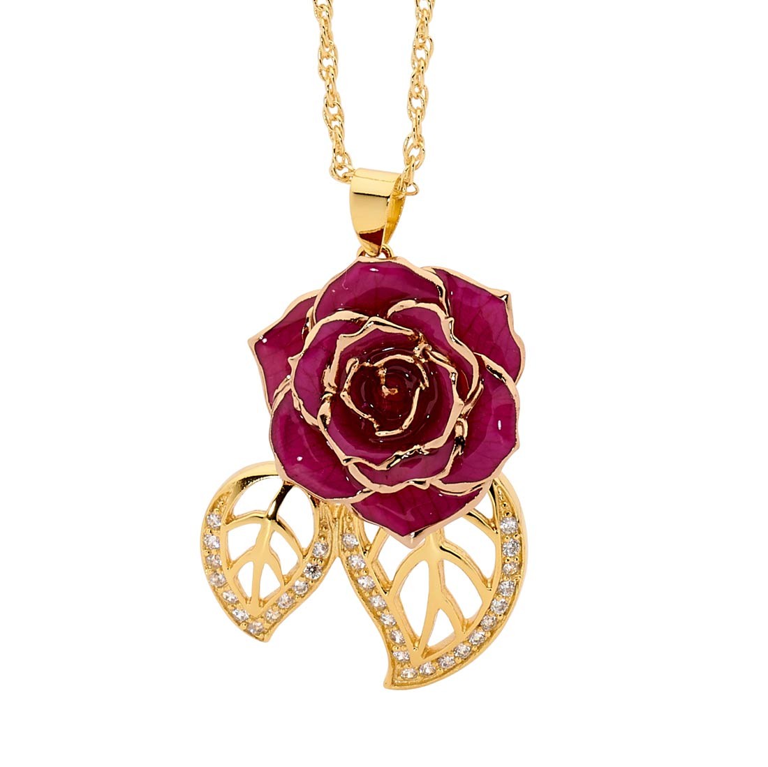 - Un élégant pendentif façonné à partir de véritables pétales de rose qui ont été vernissés et bordés d'or pur 24 ct. Pourvu d'une tête de rose miniature d'un diamètre de 3/4'', le pendentif fait 1 à 1 et 1/2" de haut pour une largeur de 1,1". La rose du pendentif est accompagnée de deux motifs de feuille incrustés de 30 diamants synthétiques et plaqués d'or 24 carats.