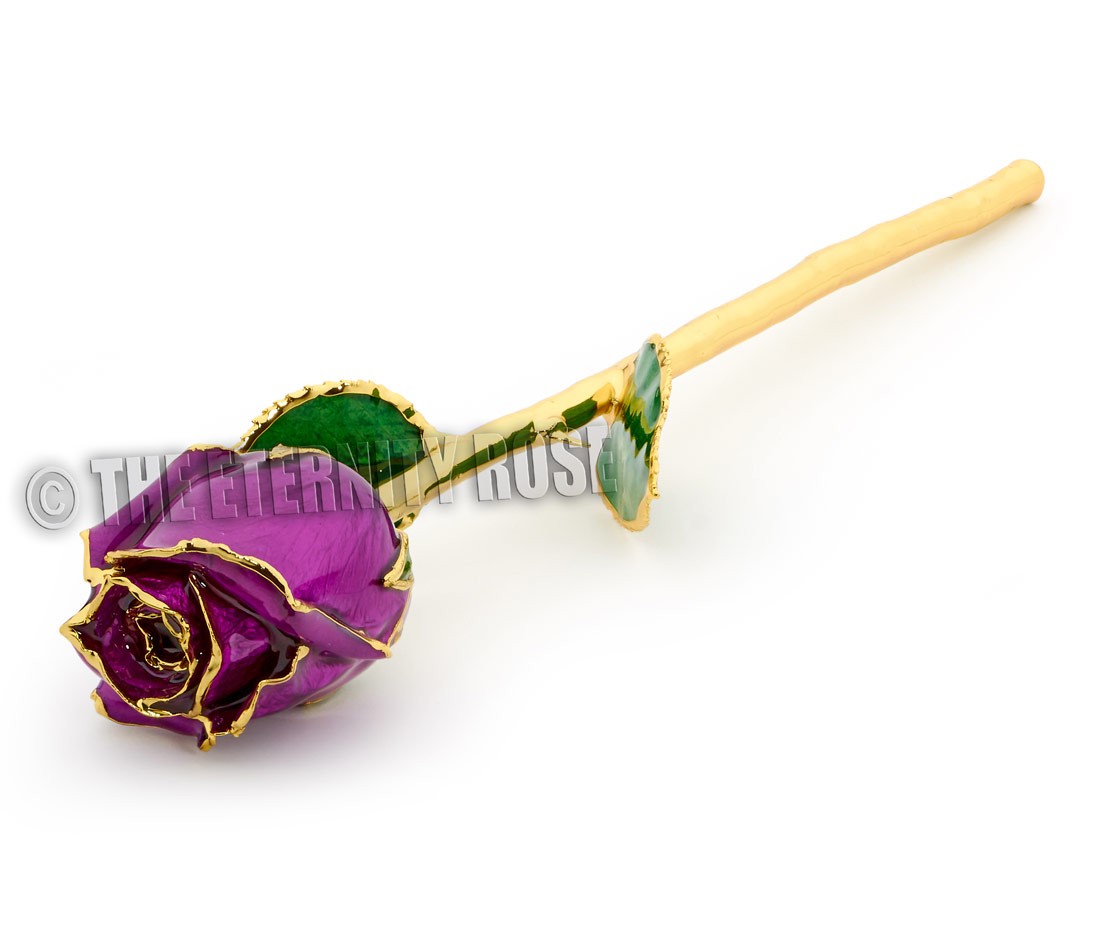 - Une rose naturelle, vernissée et parfaitement préservée, arborant des bords dorées avec de l'or pur 24 ct. Les feuilles sont en or 24 carats et croisillons vernis, et la tête et la tige de la rose font environ 29cm de long.